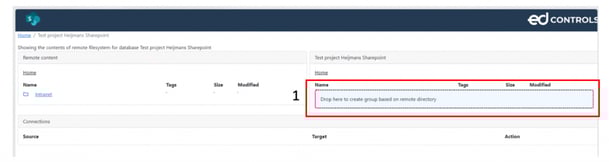 Um eine neue Verbindung zu erstellen, können Sie einen Ordner (oder eine Datei) von der linken Seite auf die rechte Seite des Bildschirms ziehen und dort ablegen (1). Dabei werden alle Dateien aus dem Quellordner in den Zielordner in Ed Controls kopiert.