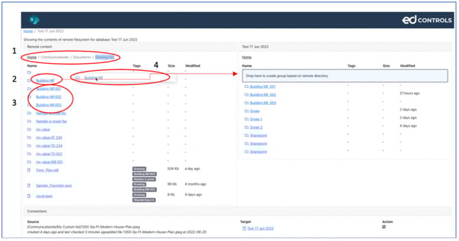 Unter (1) können Sie sehen, dass wir die Auswahl getroffen haben, nur die Zeichnungen zu synchronisieren. Unter (2) sehen Sie, dass wir einen Ordner mit den Gebäudenummern haben, an den die anderen Gebäudenummern als Ordner (3) angehängt sind. Dann wird (2) und NICHT (3) nach rechts gezogen (4). In diesem Moment werden in Ed Controls Ordner für die spezifischen Konstruktionsnummern erstellt und von diesem Moment an werden die Zeichnungen zu Ed Controls übertragen oder synchronisiert.