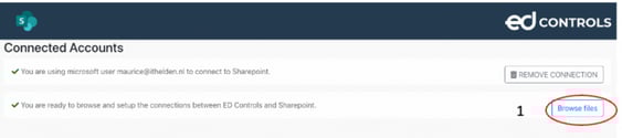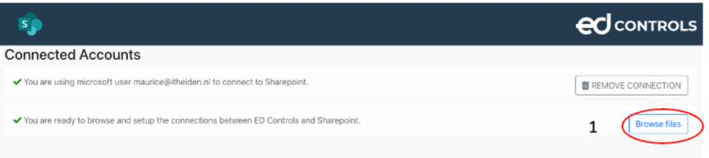 Um Dateien von SharePoint zu Ed Controls zu übertragen, müssen die Metadaten-Spalten in SharePoint mit den Gruppen in Ed Controls "verbunden" werden. Klicken Sie auf "Dateien durchsuchen", um Dateien zu verbinden (1).