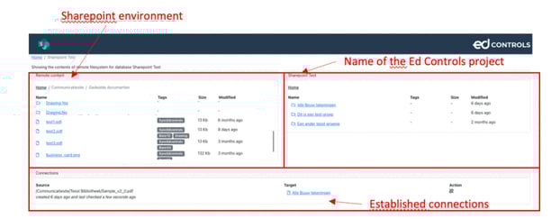 Gruppen sehen, die im Projekt in Ed Controls enthalten sind. Unten sehen Sie die aktiven Verbindungen zwischen SharePoint und Ed Controls und deren Status.